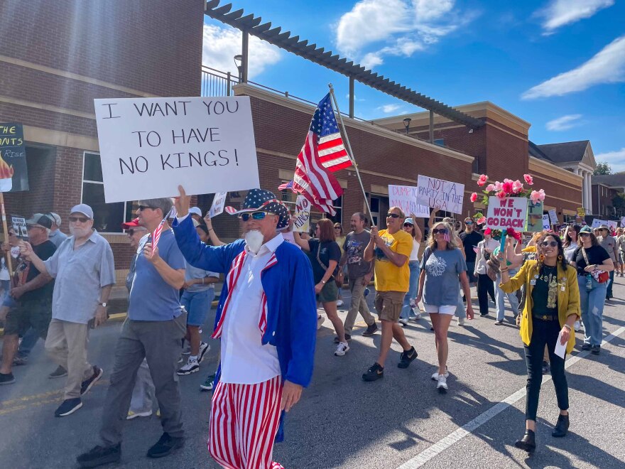 Bowling Green is the home of the International Center of Kentucky, which helps resettle immigrants across the region. Protesters there marched through part of the city’s downtown to the Warren County Justice Center, chanting anti-Trump slogans and carrying signs with messages like “No Kings Since 1776” and “We Are All Immigrants.”