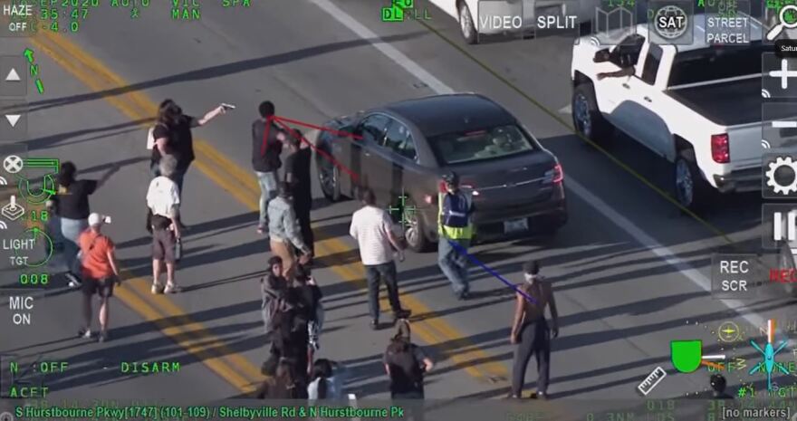 LMPD aerial footage captures the moment as a crowd of protesters march on S Hurstbourne Pkwy. From the air, video shows a protester pulling out a weapon and pointing it at the driver of a brown sedan who appears to be arguing with nearby protesters.